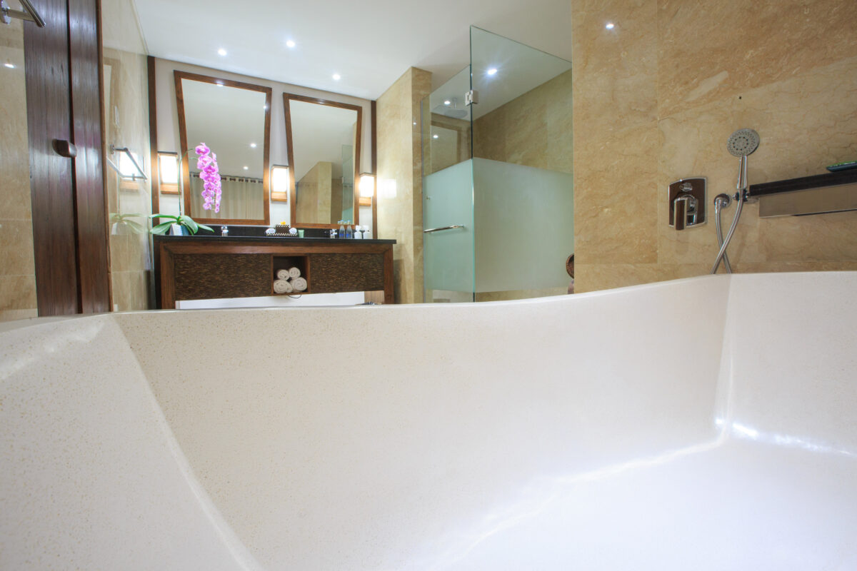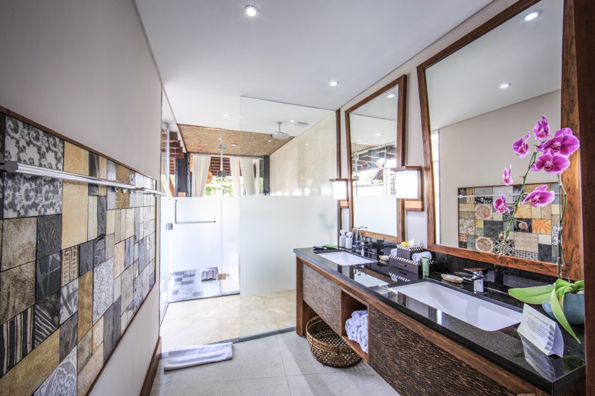 All our villas feature sleek bathrooms with rainfall shower heads, outdoor natural stone soaking tubs and premium amenities.